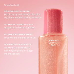 Our Pink Beach shimmer body oil is formulated with a skin-loving blend of oils including fermented saururus. kukui. cacay and squalane. along with a biomimetic blend of plant actives that absorb easily to soften skin. Added golden pearl pigments provide a sunkissed glow.